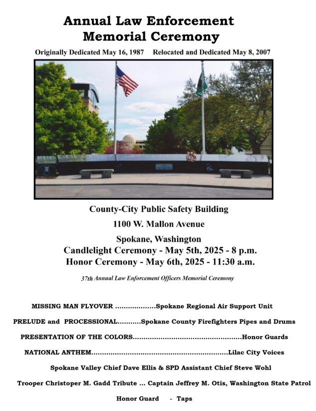 The 37th annual Spokane Memorial Ceremony will be held on Monday, May 5, and Tuesday, May 6, 2025.